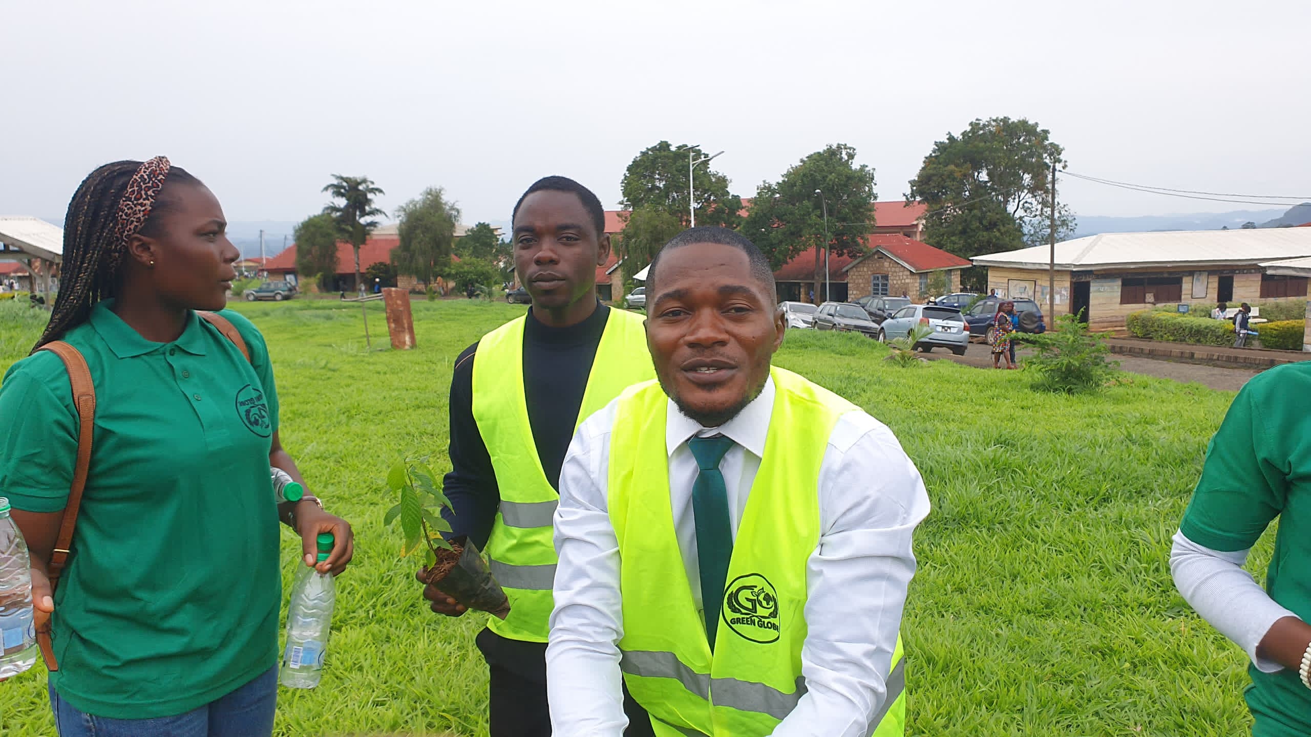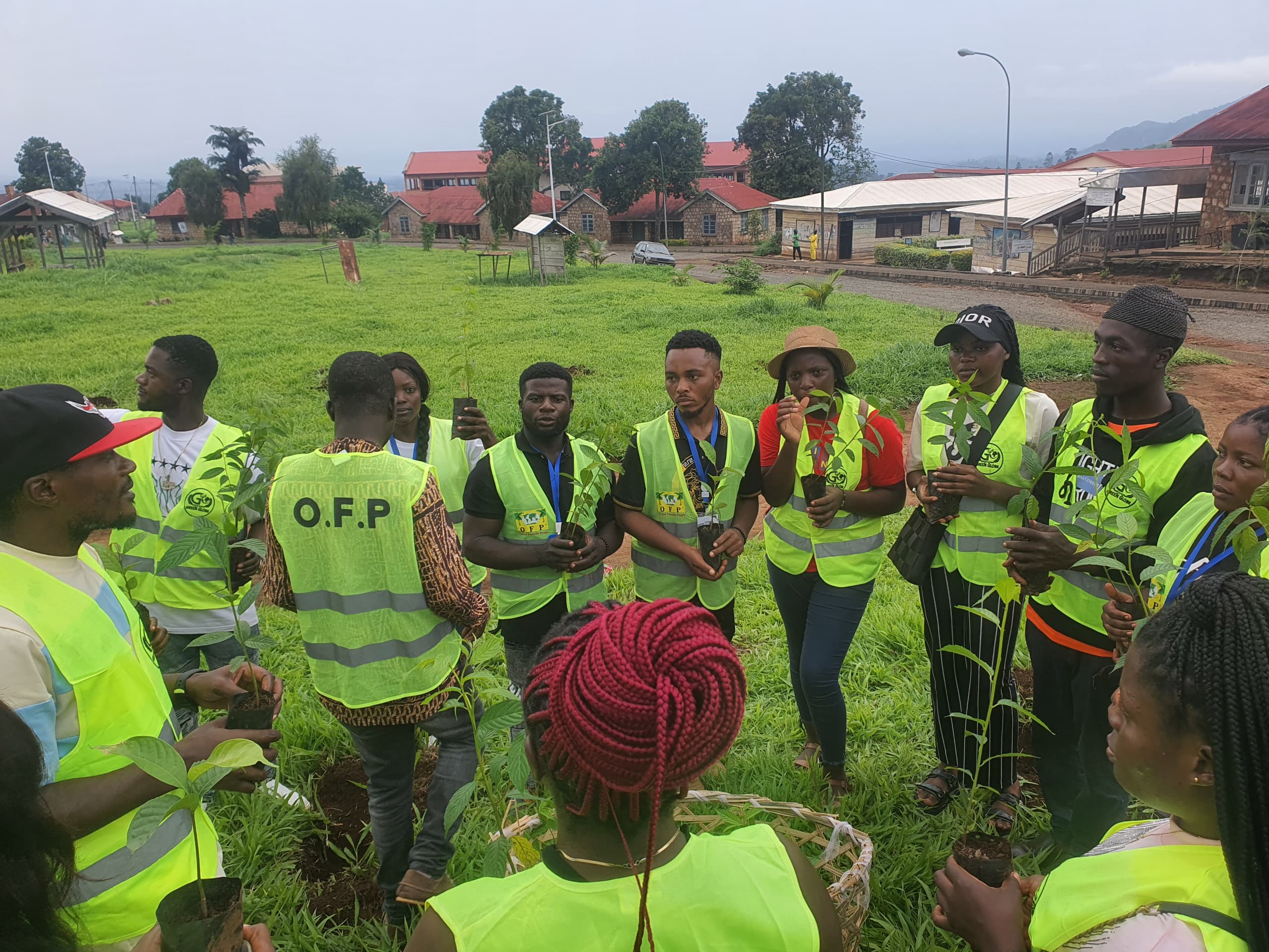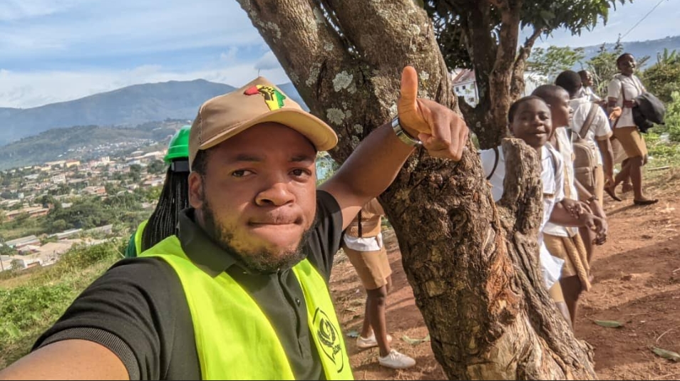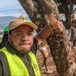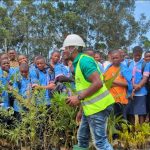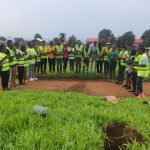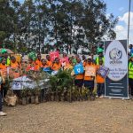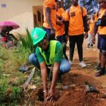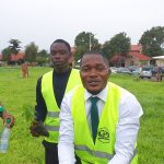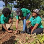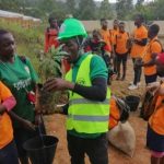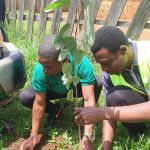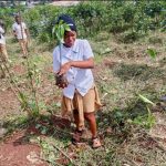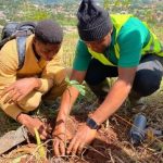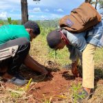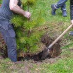 Strong Caucasian man plants a cedar tree. Dig the ground with a shovel. Planting plants. Coniferous seedlings. Ecology, nature conservation, forest restoration. Teamwork. Christmas tree.
